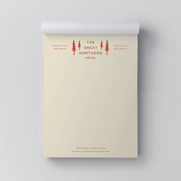 Log your dreams, secrets, and coffee orders with this notepad set inspired by the enigmatic Great Northern Hotel from Twin Peaks. Part of Herb Lester’s Fictional Hotel series, these pads invite you into a world of deep forests, red curtains, and unanswered questions—one note at a time.
